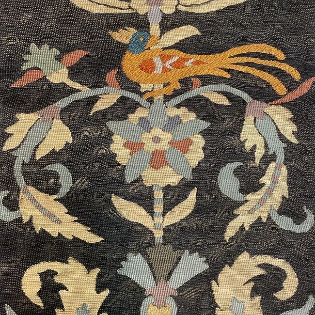 グレーに近い深緑色に鳥や花などのデザインが入ったオシャレな袋帯。