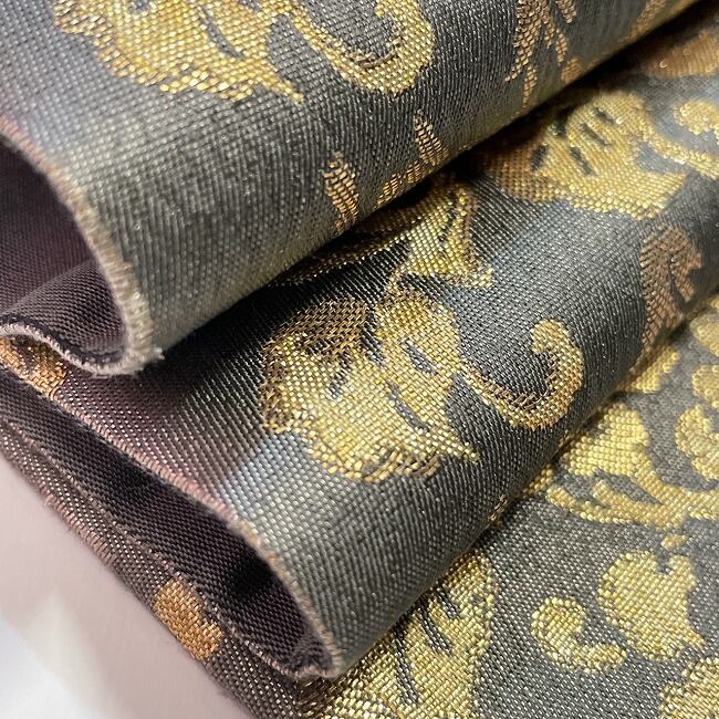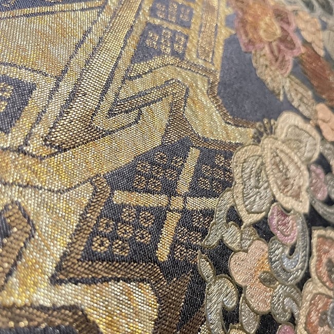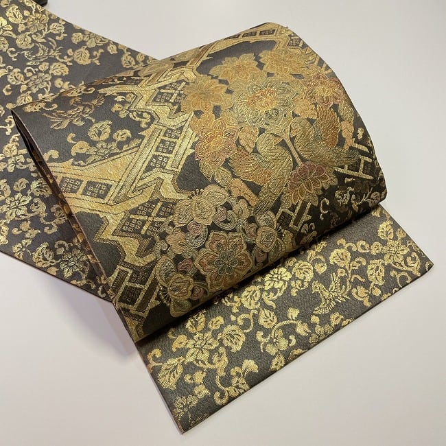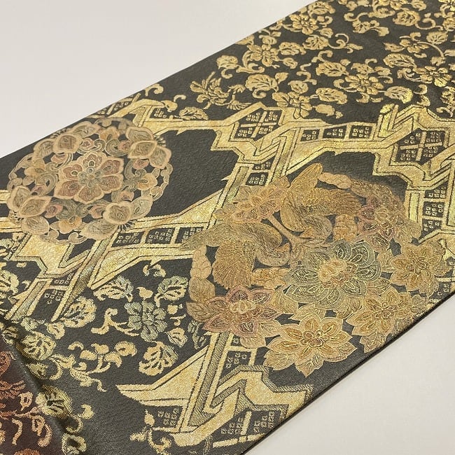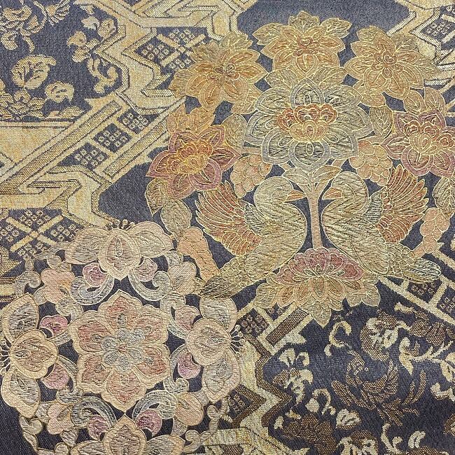 黒地に金の花と鳥の刺繍がデザインされた豪華な袋帯。