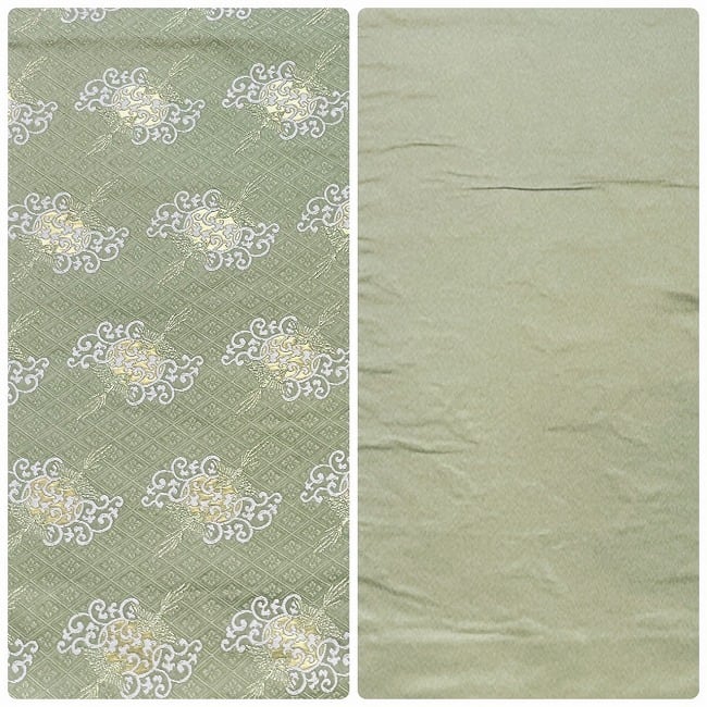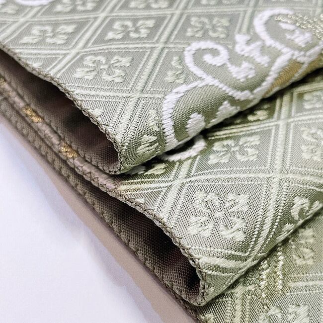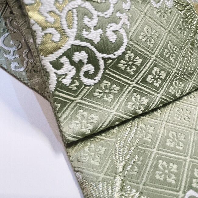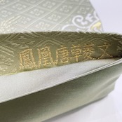 緑地に幾何学や鳳凰のデザインが入った可愛い袋帯。