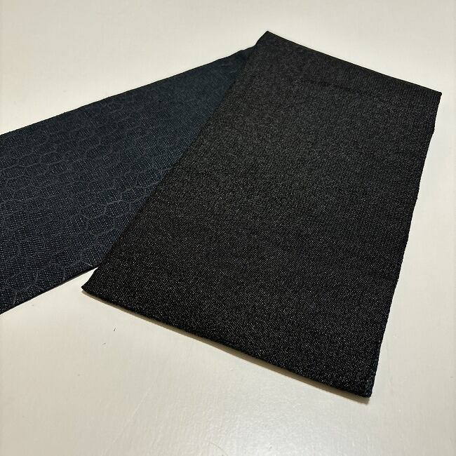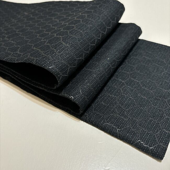 紺色地に幾何学のデザインが入ったシンプルな半巾帯。